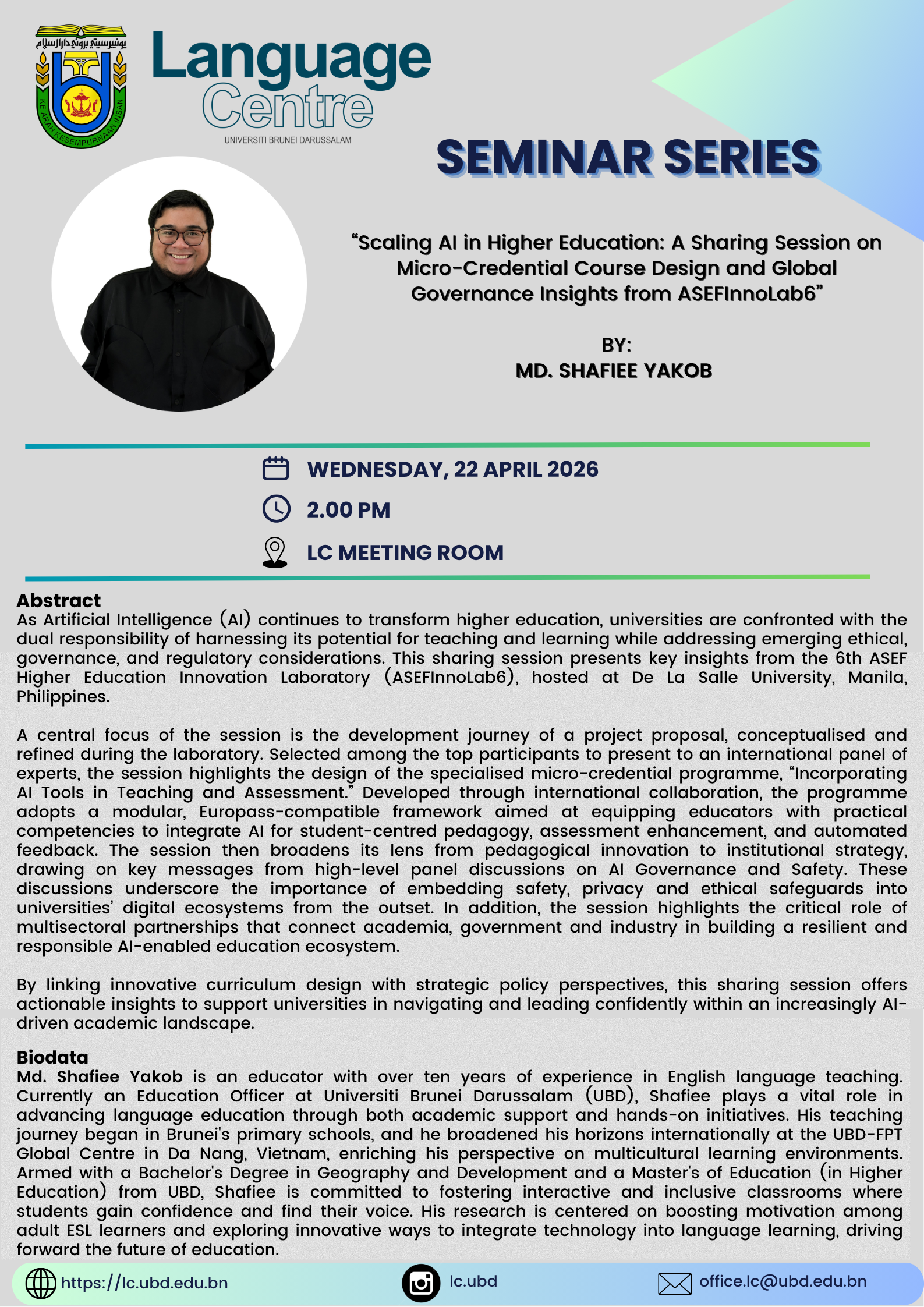 LC Seminar Series | Scaling Ai in Higher Education: A Sharing Session on Micro-Credential Course Design and Global Governance Insights from ASEFInnoLab6