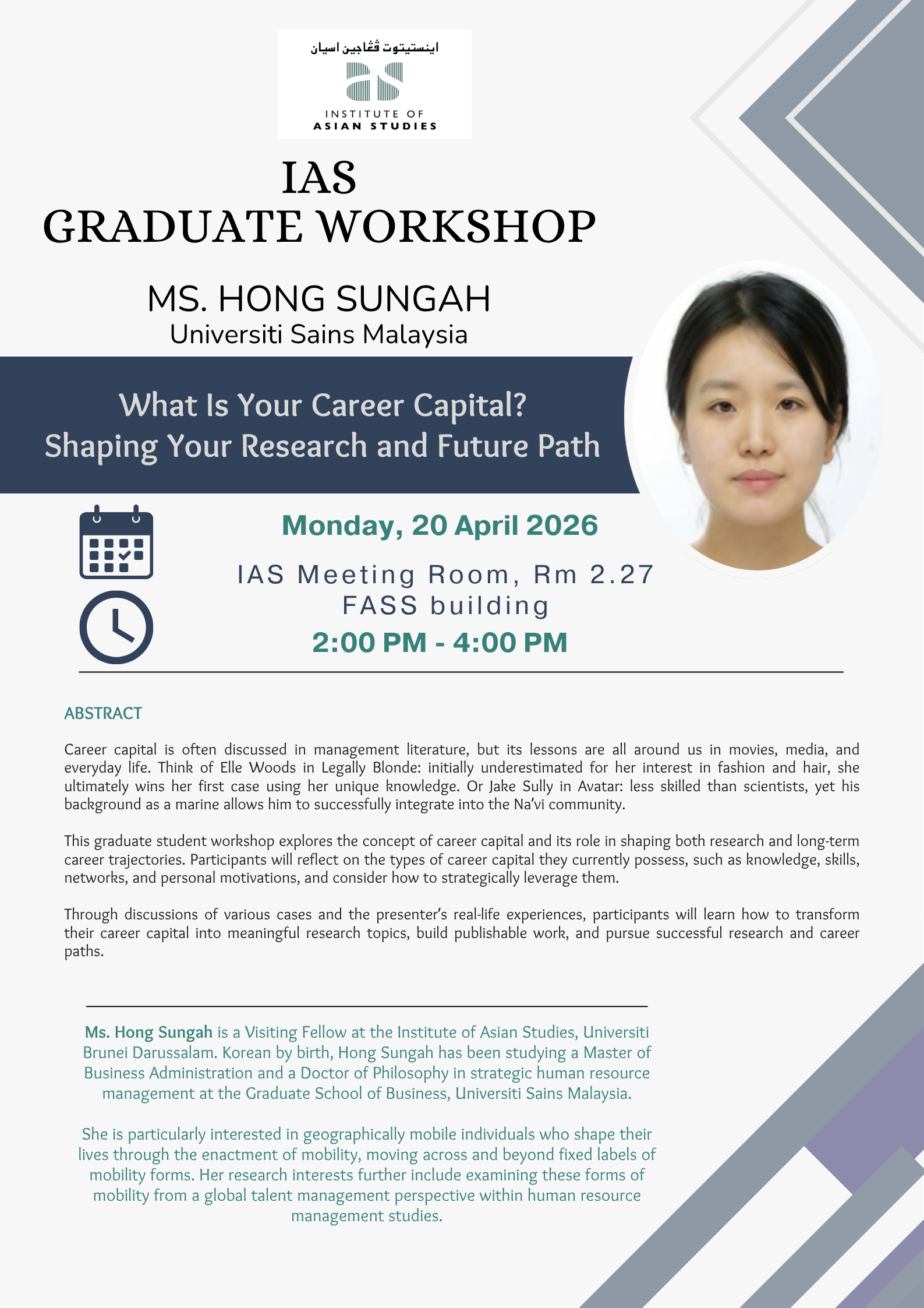April 20 @ 2:00 pm - 4:00 pm SMT IAS Workshop | What is Your Career Capital? Shaping Your Research and Future Path room 2.27, IAS Meeting Room, 2nd Floor, FASS Building