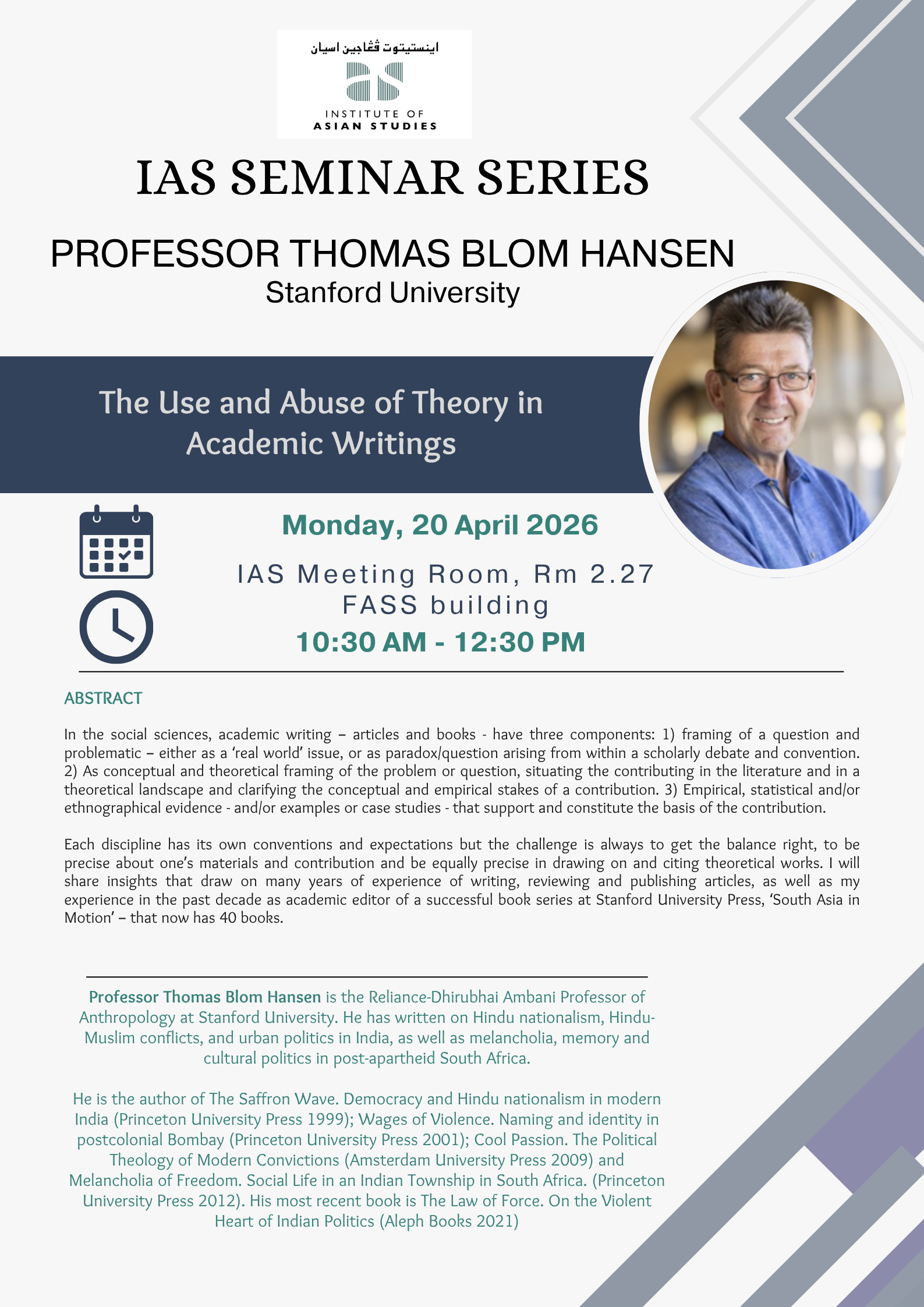 April 20 @ 10:30 am - 12:30 pm SMT IAS Seminar Series | The Use and Abuse of Theory in Academic Writings room 2.27, IAS Meeting Room, 2nd Floor, FASS Building